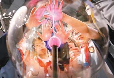 学生们在广东科学中心观察和体验“辉光球”放电现象。