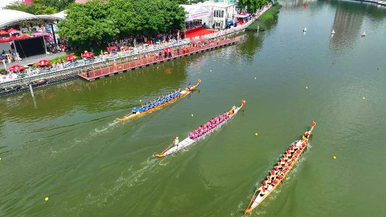锦龙盛会现场,人们既能看到水上彩龙巡游、岸上民俗文化巡游,更能看到各支龙舟队伍在河上竞逐龙王称号。