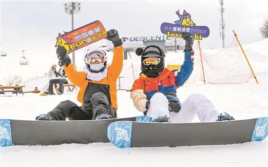 滑雪爱好者在万科松花湖度假区滑雪场庆祝“开板”