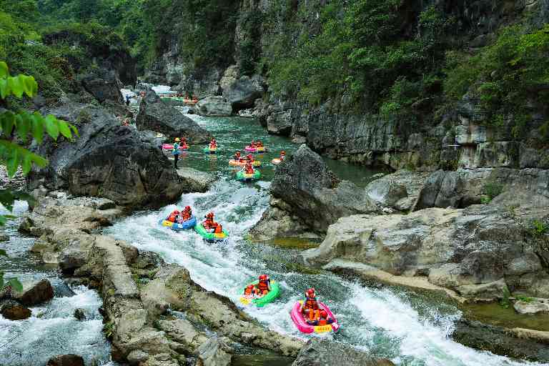 游客在湖北省宜昌市秭归县九畹溪漂流消暑享清凉。(图片来源:视觉中国)