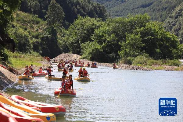 7月21日,游客在洛北河体验“休闲漂”。新华社发(胡光鸿摄)