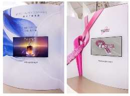 雅诗兰黛集团展馆 -“科技创新”展示墙(左)、“粉红丝带乳腺癌防治运动”展示墙(右)