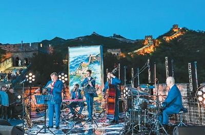 八达岭长城亮起灯火,在夏日傍晚的幽蓝天幕中向远处不断延伸。长城脚下的望京文化广场上,萨克斯演奏家伊戈尔·布特曼与乐队成员共同演奏《灯火里的中国》,用爵士风格的温暖旋律表达中俄两国文化交流的深厚情谊。