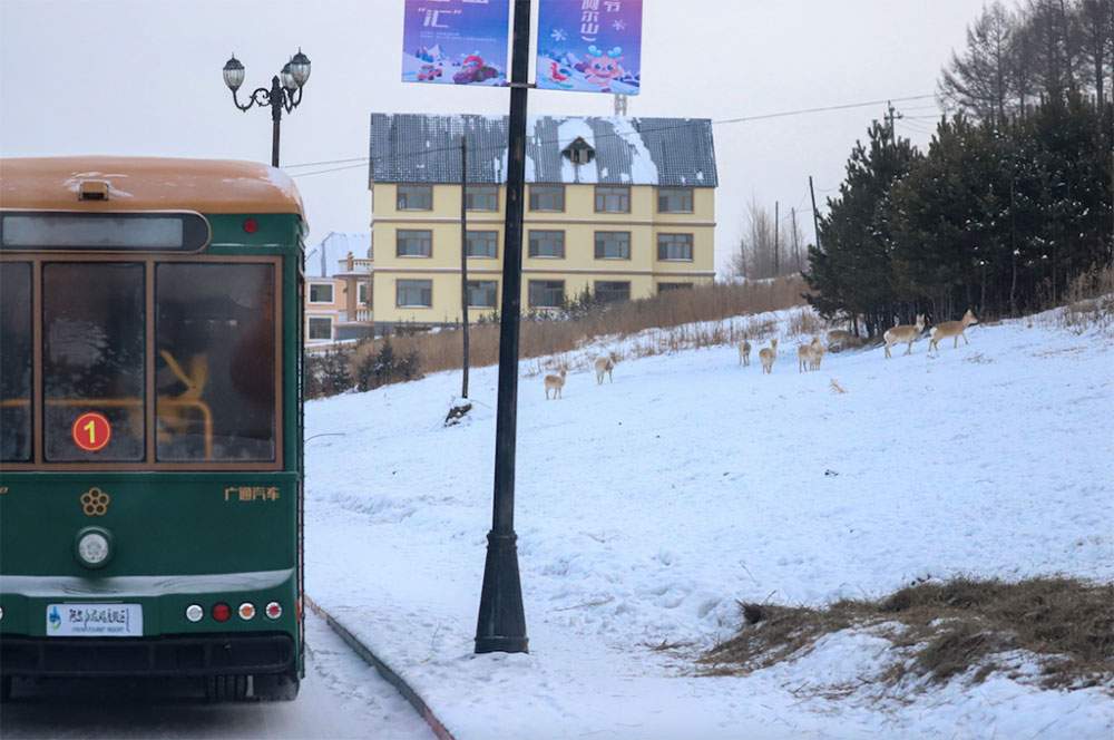 搭乘特色观光车,深入没有围栏的“动物园”,一边欣赏着雪景,一边探寻“藏”在林间的“小可爱”,幸运的话,还能看到它们在你面前奔跑跳跃、觅食嬉戏的身影。1月4日下午,从呼和浩特市、沈阳市等地组团来看黄羊的28名游客,顺利抵达兴安盟阿尔山市,开启了欢乐的“寻羊记”。