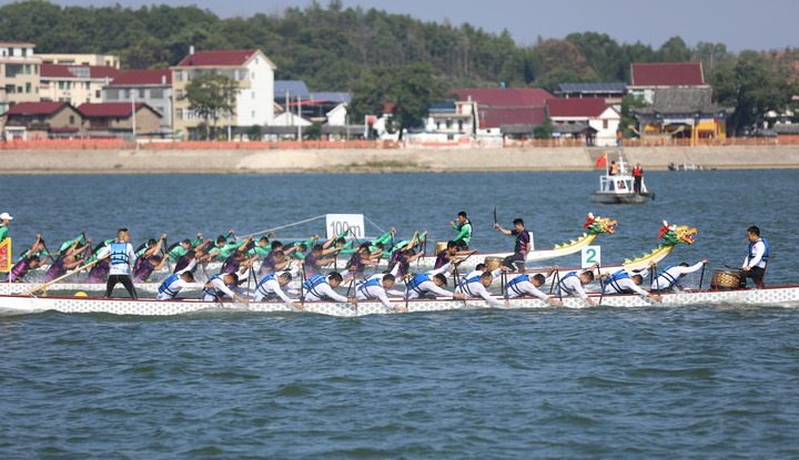 10月24日,赣江万安段心安湖水面上鼓声阵阵,江西省第七届全民健身运动会龙舟比赛在这里火热进行。来自江西11个设区市的20支参赛队伍挥桨竞技,展示 “速度与激情”。