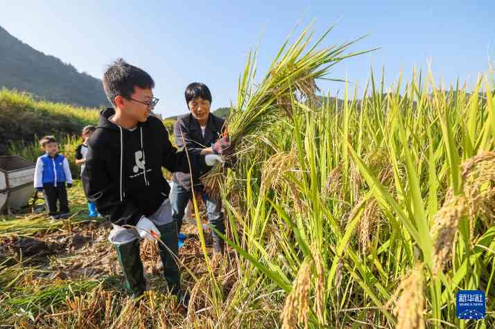 11月2日,在锦北街道龙马村的稻田里,小游客们在体验割稻及传统打稻。